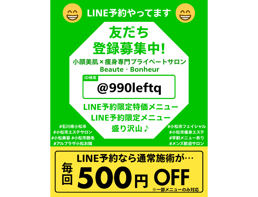 🧖♀️小顔美肌×痩身専門プライベートエステサロン🧖♀️ 知識・施術経験豊富なスタッフが最新機器でしっかり施術✨お顔・お身体のお悩み、お気軽にご相談下さい🎶 マンツーマン個室サロンなので周りを気にする必要も御座いません。 都度払い&勧誘ナシ✨決済方法多数✨エステのご利用が初めての方や男性にもおすすめです🤲 🚉JR小松駅より車で3分🚘/徒歩9分🚶♀️ 🏬アルプラザ小松お隣(徒歩1分以内)✨ サロン専用🅿️「入居者用K」をご利用下さい🚘 取り扱い施術【脂肪溶解剤レモンボトル/ラジオ波フェイシャル/韓国式フェイシャルリフト/キャビテーション痩身/ラジオ波痩身/エステダーマペン/ラジオ波フェイシャル/EMSエレクトロポレーション/毛穴洗浄/光フォトフェイシャル/最新式SHR脱毛/最新式IPL脱毛/キッズ脱毛/光バストアップ豊胸ケアなど】 決済方法 ~お支払い方法~ 【現金/VISA/JCB/Master/AMEX/Diners/Discover/銀聯/ID/QUICPay+/ApplePay/PayPay/auPay/楽天Pay/デビット/交通系電子マネー/COIN+/d払い/SmartCode/J-CoinPay/トチツーカ/トチポ】 ※一回払いのみ※決済併用不可 ※北國VISAデビットPt/トチカ/トチポ併用可